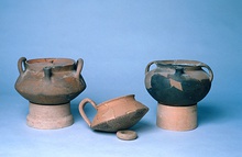 | Description: | Much of body and most of rim missing; restored in plaster. Round-bottomed, squat, round-bodied pot; flaring rim, flanged inside. Pierced spout from shoulder; vertical strap handles (one missing) at each side, shoulder to rim. Coarse gritty clay, burned black to gray; much burning inside and out. | |