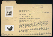 | Description: | Mended from many fragments; mouth, neck, handle and much of walls missing, including most of figured panel. Broad, low, flaring ring foot; body nearly spherical. Of the figured panel only a bit of left border remains and the lower right corner, with legs and part of trunk of a nude male figure running to right; details incised. Panel is bordered by a gray to black line. Deep buff clay; good black glaze; underside of foot reserved. Traces of a narrow band of applied color circling body below figured panel. | |