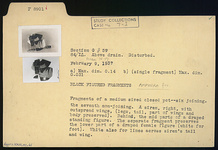 | Description: | Fragments of a medium sized closed pot -six joining, the seventh non-joining. A Siren, right, with outspread wings (legs, tail, part of wings and body preserved). Behind, the middle parts of a draped standing figure. The separate fragment preserves the lower part of a draped female figure (white for foot). White also for lines across Siren's tail and wing. | |