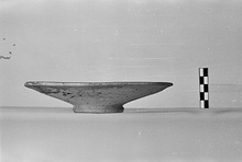 Description:   Fragments missing from rim and floor. Plate with ring foot and plain rim, slightly downturned. Irregular grooved circles around the center.