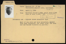 | Description: | Most of one side and base preserved, mended from many fragments; the other side, the neck and one handle restored in plaster. Reddish-brown micaceous clay. Household jar. | |