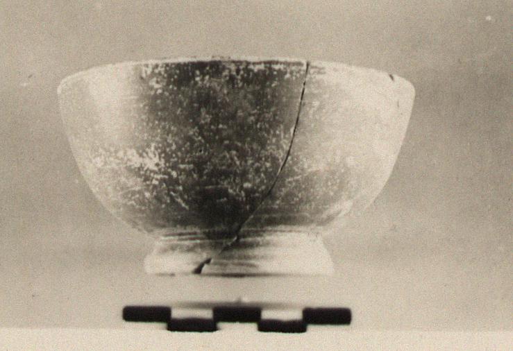 | Description: | Fragment of side missing; restored in plaster. Similar to P 8909 (Χ 58), but the foot somewhat higher and more flaring, and the glaze better preserved. A rough cross scratched inside the foot, beneath. Pergamene Ware. ADDENDA P 8909: Small bowl with ring foot and no change in curve of sides for rim. | |