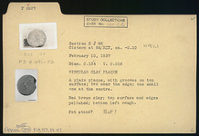 Description:   A circular plain plaque, with grooves on top surface: two near the edge; a small one at the center.