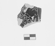 | Description: | Broken all around. Fragment of large closed pot. Upper legs of nude male figure striding left (Herakles - part of lion skin hangs down between legs?) at left the scaled body of the Hydra(?). A red dot in each scale. | |