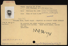 | Description: | Moulded base only preserved. On outside and undersurface, scraped bands colored with miltos. Inscribed on concave undersurface: <graphic> Good black glaze, inside and out. | |