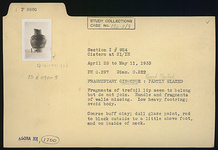 | Description: | Fragments of trefoil lip seem to belong but do not join. Handle and fragments of walls missing. Low heavy foot ring; ovoid body. Coarse buff clay; dull glaze paint, red to black outside to a little above foot, and on inside of neck. | |