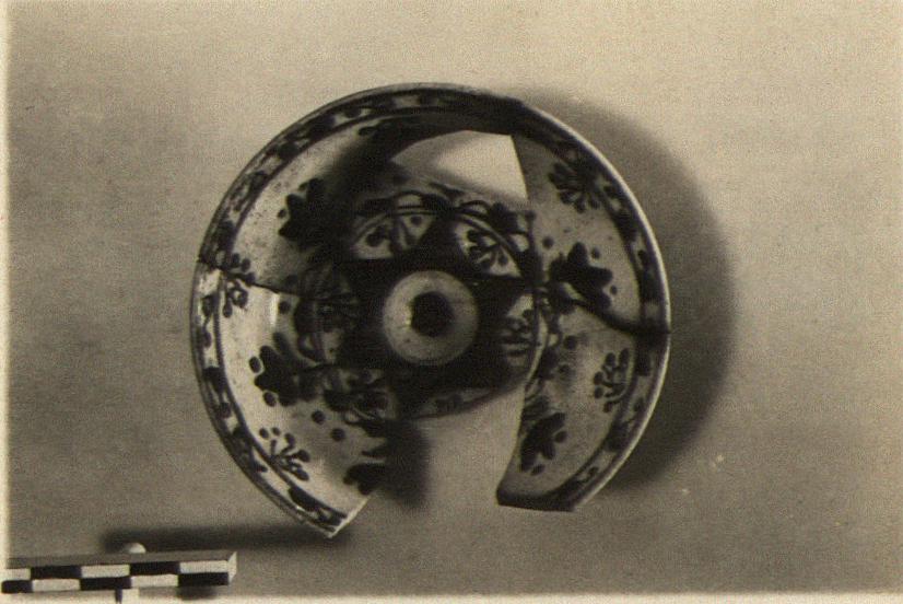 | Description: | Mended from several pieces; fragments of rim and body missing. Plain rim; small low ring foot. Glazed and decorated inside and out: background dull white; geometric and floral designs in blue, green, red, yellow. Raised boss at center of interior. ADDENDA Broken and restuck. Piece of floor missing (Nov. 1951). | |