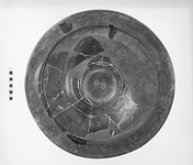 | Description: | Fragment from center of heavy plate; ring foot preserved, nothing of rim [Max. Dim. 0.18]. Two broad shallow concentric grooves at center and another, marked by sharp narrow grooves, further out. Traces of stacking. Graffito on inside: <graphic> Dull firm glaze, somewhat mottled on the foot; resting surface and inside unglazed. ADDENDA Many more fragments of the floor and bits of the broad double-curved rim (none of its edge) found in going through sherds. Restored in plaster (Rest. H. 0.065; Est. Diam. 0.46; Diam. (inner edge of rim) 0.355). | |