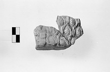 | Description: | Fragment preserving part of wall, with flat floor and low raised base set off by grooves. On wall, conventionalized relief pattern of grape clusters and vine (no leaves). End of handle attachment covering one cluster preserved. Gray clay. Traces of vitreous bluish-green glaze on exterior and interior. | |
