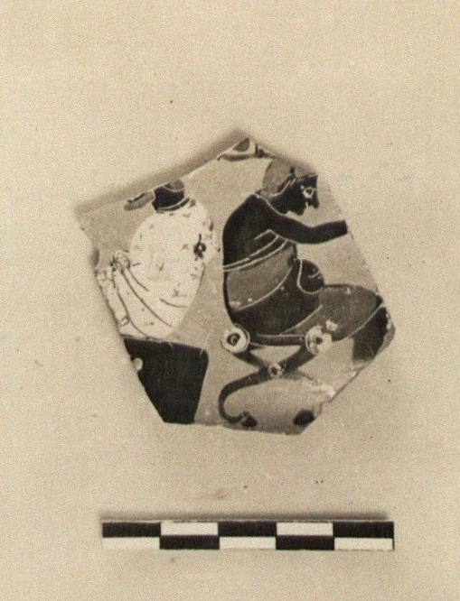Above, tongue pattern, with part of a red tongue preserved. Below, part of ground line and start of panel on body: two men, seated back to back. The left hand figure -legs and most of head missing- sits on a solid rectangular seat; he wears a white cloak decorated with incised crosses wrapped tightly around him, covering his arms. Lines for folds incised through white, but not through glaze underpainting. Red for hair and beard. The right hand figure -feet, right hand and top of head missing- sits on a folding stool; a cloak wrapped tightly around him leaves his right shoulder and extended right arm bare. Red for hair and alternate broad stripes of cloak. White for joints of stool.