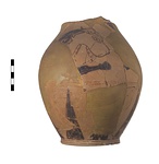 | Description: | Fragmentary; the body largely restored in plaster; no remains of neck or handle. The low ring base is decorated with two narrow bands of reddish-brown paint; above this base, the broad rays rise for nearly half the height of the pot; two narrow stripes divide them from the shoulder panel: solid black in back, in front a large head of a lion, drawn in outline, the mane and a single projecting paw solid. Pinkish clay. Paint lustrous black to brown. ADDENDA A few small fragments added from B sherds [Summer 1935]. | |