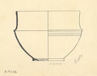 Restored in plaster. Ring foot with a groove inside. Convex lower body, projecting slightly beyond the high straight rim, making a ledge. Two grooves below ledge; from grooves to above foot, bands of wedge-shaped dents, perhaps made with a roulette? No handles preserved.