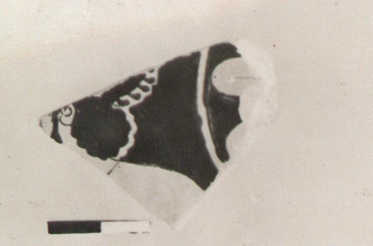 | Description: | From wall of an open pot, probably a krater. Back part of head and shoulder of man facing left with elaborate hair-dressing and beard. At right segment of handle palmette(?). Pinkish-buff clay; good black glaze inside and out. Relief contour for shoulder and ornament. Hairline reserved. | |
