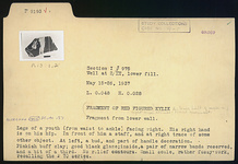 | Description: | Fragment from lower wall. Legs of a youth (from waist to ankle) facing right. His right hand is on his hip. In front of him a staff, and at right trace of some other object. At left, a bud, and part of handle decoration. Pinkish-buff clay; good black glaze; inside, a pair of narrow bands reserved, and a bit of a third. No relief contours. Small scale, rather fussy work, recalling the P 70 series. | |