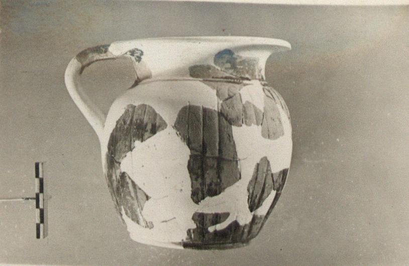 | Description: | Mended from many pieces. Part of wall, handle, base, missing; restored in plaster. Very low foot ring, sharply set off from wall; squat body; low neck with flaring lip; vertical double handle. Body with vertical flat ribs, in groups of two narrow ones and a broad one. Neck set off from shoulder by a narrow ridge, beaded. On each broad rib or panel, a stamped pattern: a single palmette hangs from groove at top; below it two upright palmettes, above a band of four doric leaves, from below which again hangs a single palmette. Black glaze, inside and out, partly fired red and much worn in places. Reserved: bottom of foot, except inner side of foot ring, and a circle and dot in center. | |