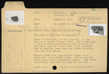 | Description: | The edge of the vase is preserved. Close to the edge, on the exterior, is the head of a woman, facing right. She is wearing a veil or himation drawn up over the back of her head; beneath it her hair curls loosely. Eye in profile, nose long and rather pointed; lips and chin heavy. Careful work with good relief lines; hair indicated with dilute glaze. On the inside, black glaze with a reserved stripe. The glaze is entirely worn off the edge of the rim. Attic clay; black glaze much chipped. | |