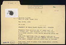 | Description: | Fragment from shoulder and upper wall of a closed pot. Low shoulder set off from wall by a broad cavetto, with narrow moulding above and below. Body with leaf-like ribs or panels outlined by grooves. Shoulder and wall panels thickly covered with small stamped circles, with dots in centers. Fine clay, buff to gray; fine black glaze outside, drips inside. | |