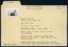 | Description: | Handle, part of spout, much of top and walls missing. Broad low base, slightly concave; sharp shoulder; top concave. Small flaring spout. Hollow center. Reserved: underside of base. Pinkish buff clay; fair black glaze outside; a thin wash inside. | |