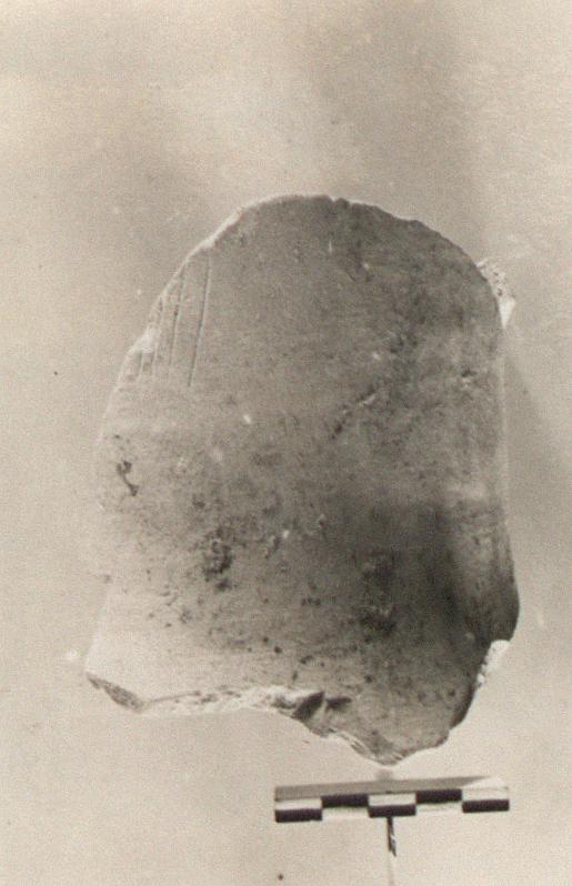 | Description: | Fragment from neck. Fairly deeply scratched, well up on neck: <graphic> Fabric as SS 6918 and SS 6919. Inside pitched. A number of fragments with similar incomplete straight line graffiti, left in tin. | |