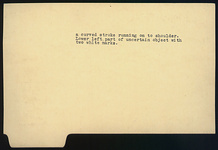 | Description: | Broken all around. Fragment of a large open vase. Interior: at top, black glaze, then band of thinned glaze, 0.017 wide, then black glaze. Exterior: full front head of a panther left. Red for shoulder; white for nose, forehead, throat, and a curved stroke running on to shoulder. Lower left part of uncertain object with two white marks. | |