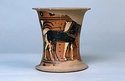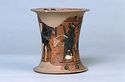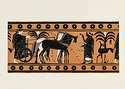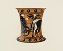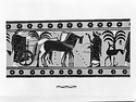 | Description: | Mended from many pieces; most of the lip, about half the base and scattered fragments of the figured scenes missing. A cylindrical stand, open at top and bottom, with a rather concave profile and simple slightly projecting rim and base. Interior: horizontal stripes, alternately black and reserved, varying from ca. 0.01 to 0.02 in width, widest towards the middle. Exterior: above and below, black rosettes with white centers. The figured scene completely encircles the vase and is separated from the rosettes by two black lines. Artemis, right, wearing a long himation, mounts a chariot drawn by four horses which stand beside a palm tree. In front of the horses and facing them stands Apollo in long chiton and himation, holding a seven-stringed lyre (strings incised) in his left hand and a flower in his raised right. Behind Apollo a young deer, left, stands under a second palm tree. The deer and Artemis are back to back. In the field, nonsense inscriptions in glaze: above the backs of the horses, horizontally, Ο Ι Ε; between their legs, vertically, Ο Ρ Ε Ι Ο; between them and Apollo, vertically, Ο Ι Ε Ε Ο Γ [cf. AJA 33 (1929), pp. 361-362, all of which, however, belong to the mid-sixth century]. The added colors are well preserved. White is used for Artemis' flesh; for one of the horses and for decorations on the harness of another; for Apollo's wreath, the frame of his lyre, the visible lower part of his long chiton, and the dots along its lower border; for the throat, chest, belly stripe and tail of the deer; for the hearts of the two palm trees; and for the dots of the rosettes in the borders above and below. Red is used for Artemis' fillet; for crosses and folds on her himation; for four bosses on the chariot car; for the reins; for the tails and manes of the white horse and the nearest black one; for some of the harness; for dots and folds on Apollo's himation; and for the outer edge of the lip of the pot. | |