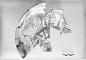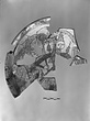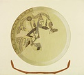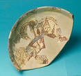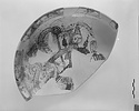 Description:   Less than half preserved. Large plate on very low ring foot. Almost vertical rim A warrior, facing, wearing a high conical cap, a tight-fitting suit of crisscrossed underwear covering arms and legs, and a fustanella. His long curly hair falls below his shoulders. In his left hand he carries a shield, in his right a short staff topped with a rosette. Two tree-like objects rise from his shoulders. At his right is an eagle or falcon, and around him, encircling the plate, is coiled a dragon. The rim is decorated with a border of alternate lozenges and teardrops above a debased guilloche.