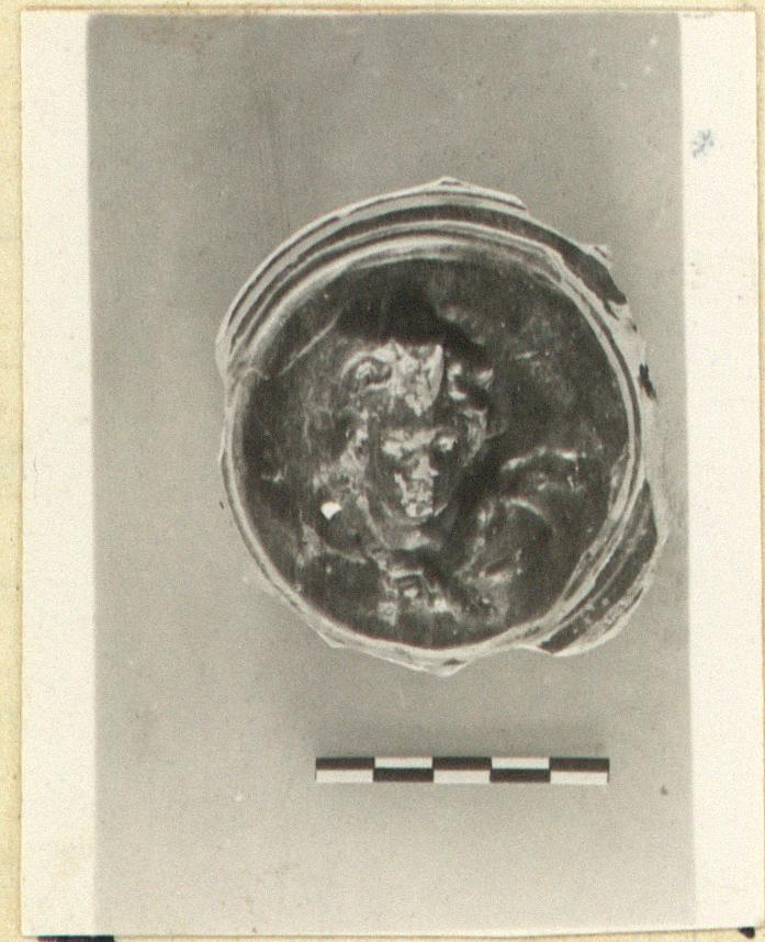 | Description: | Bottom, with medallion, preserved. Ring foot; concentric grooves outside. Inside, the medallion surrounded by a double miltos groove; in relief, head and shoulders of a Satyr with a wreath on his head, and a skin knotted across his shoulders. Cf. P 155 (same mould?). Hellenistic. | |