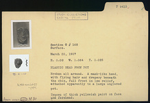 | Description: | Broken all around. A mask-like head, with flying hair and drapery beneath the chin, full front in low relief, attached apparently to a large unglazed pot. Traces of thick yellowish paint on face and forehead. ADDENDA Is this ancient? (JWH). | |
