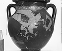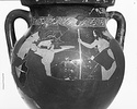 | Description: | Base intact; lip, neck, shoulder and handles largely complete; lower body fragmentary. Restored in plaster. Shape: late variety of amphora, type B. A) Charioteer in long chiton driving a team of four horses, left; toward him, behind the horses, flies Nike. She wears a Doric chiton and an embroidered sakkos open at the top, and she carries an amphora of Panathenaic shape. Border at top, palmette and lotus; below, maeander with saltire squares. B) Winged female figure, wearing chiton and himation, holds out a patera to a bearded male figure. He wears an himation which leaves his right shoulder bare, and holds a lotus-tipped staff in his right hand. Slanting palmettes above maeander and saltire squares below. Around the vertical face of the lip, ivy wreath: leaves reserved, stem and berries in white. Tongue pattern around lower handle attachments. Considerable relief contour on A; none on B. Brown inner drawing on the horses. Brown wash under the charioteer's hair; brown also for a few details: palmettes on neck of Nike's amphora; horses' eyes and ears; details of harness. | |
