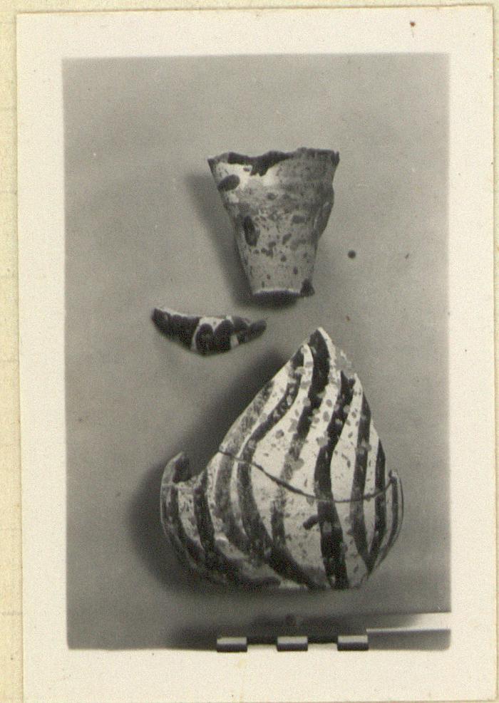 | Description: | a) Preserves the base and lower walls. b) The neck and lip. c) A small piece of shoulder. Restored in plaster. A small jug with flat bottom and trefoil lip. The upper handle attachment preserved. On a white ground, alternating green and black wavy lines descending from the shoulder. The whole covered with a very thin colorless glaze. Red clay. | |
