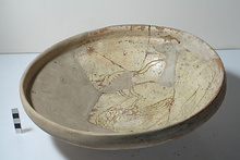 | Description: | About one-half preserved. Restored in plaster. A wide flaring bowl on high ring foot; inturned rim. In the center, a bird, crudely drawn, head and feet missing; conventional ornaments in field. Buff clay; poor light yellow glaze. | |
