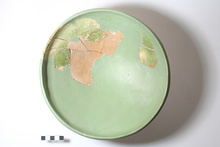 | Description: | Profile preserved. Restored in plaster. Slightly flaring ring foot; inturned rim. Uneven green glaze on the inside. Thin white slip on outside. Buff clay. | |