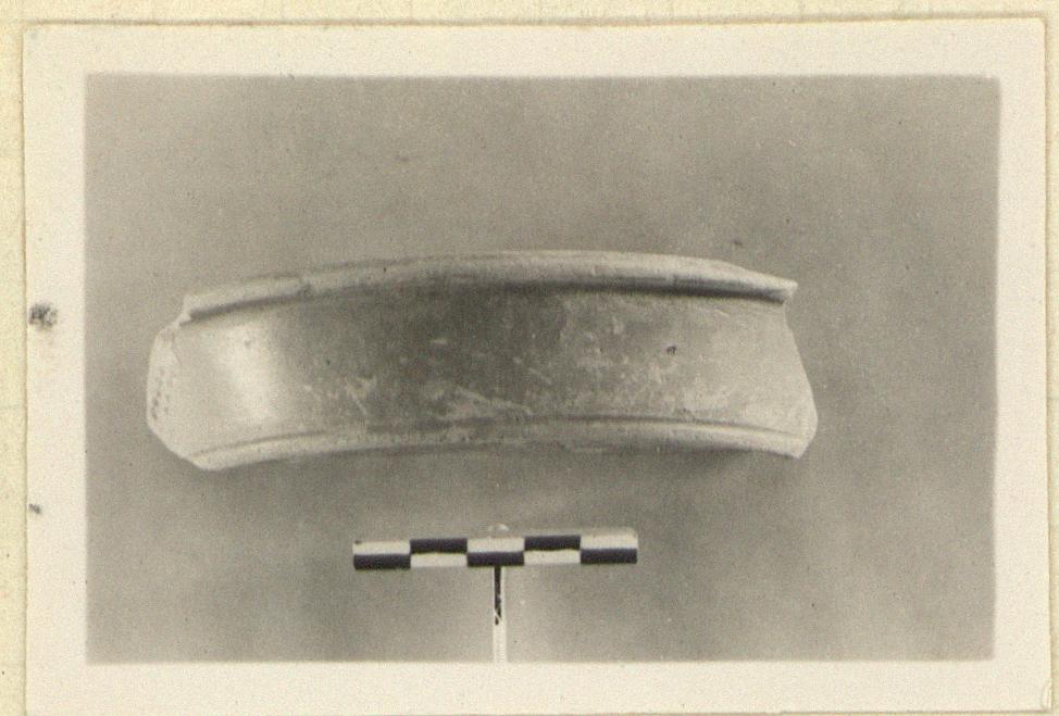 | Description: | From the side of a low open Samian A dish with outcurled rim. Mended largely complete and restored in plaster. Very low ring foot; the wall above it set off by a groove. Micaceous brown clay. Samian A Ware. | |