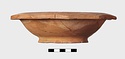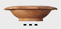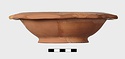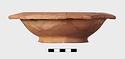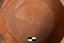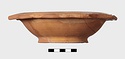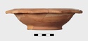 Description:   Mended from several pieces. Rather more than half preserved. Open bowl with low ring foot; rim round at inner edge, polygonal at outer. At center of floor, a swastika in a square with a circle round about.