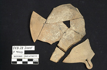 | Description: | Much missing from rim and floor; and one handle. Similar to P 9708 (ΛΛ 666), but the base much lower, broader, and extremely rough, and the handle smaller, somewhat pinched together and without ears. Unglazed. ADDENDA P 9708: Deep plain saucer on small raised base, left rough. Two horizontal band handles smeared on to rim, the ends finished with ears. | |