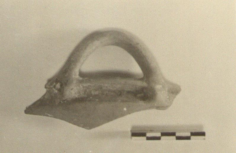 | Description: | Fragment preserving part of a sharply concave rim set at an angle to wall. Horizontal handle, round in section, rising vertically from the rim. Light gray clay; scanty remains of darker wash. | |