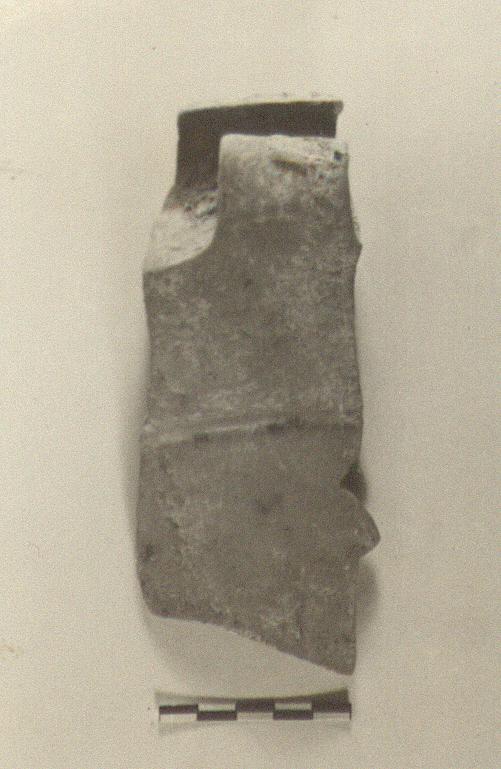 | Description: | Fragment of a large deep steep-walled bowl, with high angular concave rim set at an angle to body and finished with a small projecting rim, triangular in section. Broad vertical band handle, from junction of wall and rim, to middle of rim, not rising to lip. Moulded ring half way down wall as preserved. Light gray clay. | |
