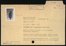 | Description: | Part of body and part of lip missing; otherwise complete. Fusiform shape; single handle. Ridge around toe and lip; body irregularly wheel-grooved. Dark red highly micaceous clay. A yellowish powdery substance which rubs off very easily all over surface. | |