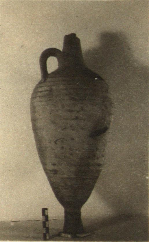 | Description: | Fragments of body and most of lip missing. Single handle. Wheel ridges on narrow neck and tapering body. Small high conical foot. Painted under handle in dull black: <graphic> Dark red highly micaceous clay. Yellowish powdery substance very thick on one side. | |