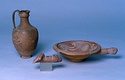 | Description: | Handle intact. Adjacent part of ridged rim and body also preserved. Short white lines across top of handle. Part of white spiral decoration on interior of bowl. Dull red glaze. | |