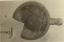 Description:   Seven joining fragments preserve most of the bowl, with a moulded handle in the form of an animal's head. Low ring foot. Two grooves on rim. Series of spirals in white on interior. Short white strokes across top of handle.