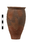 Description:   Full profile preserved; part of wall and rim missing. Restored in plaster. Small flat bottom; body, narrow below, swells somewhat above and then draws in to small flaring lip set off on outside by ridge. Decoration in applied dots: three rows of half circles, forming festoons below two lines.