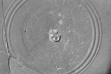 | Description: | Part of floor and side missing. Restored in plaster. Shallow Samian A bowl with incurved rim. In center of floor, within three stamped concentric circles, a dot rosette. Orange-red clay and glaze. | |