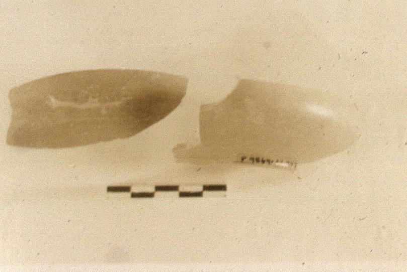 | Description: | Two fragments of a shallow Samian A bowl with very low ring base and incurved rim. Joins with P 22067. Orange clay and glaze. The clay and glaze on the inside are blackened by burning. | |