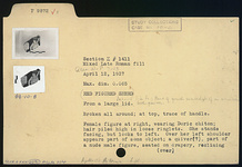 | Description: | From a large lid. Broken all around; at top, trace of handle. Female figure at right, wearing Doric chiton; hair piled high in loose ringlets. She stands facing, but looks to left. Over her left shoulder appears part of some object; a quiver(?), part of a nude male figure, seated on drapery, reclining on his left elbow. No relief contours; dull brown for hair. | |