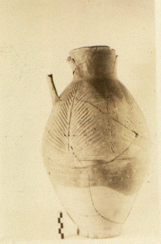 On body, gouged decoration of pine trees or palm leaves, separated by wavy vertical lines.