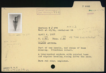 | Description: | Part of one handle and chips of base missing; otherwise intact. A long-necked amphora with pointed base and angular handles rising above the neck. Dark red clay. Unglazed. | |