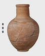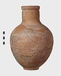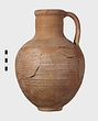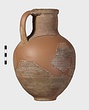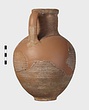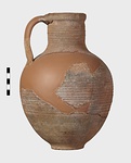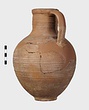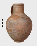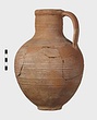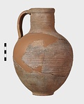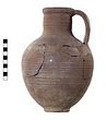 | Description: | Mended from many pieces; handle and fragments of body missing. Round mouth; thickened lip. Ribbing on neck and body. Rather coarse brown clay, fired dark at core like Byzantine. Thin fabric. Unglazed. | |