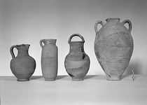 Description:   Fragments of mouth missing; otherwise complete. Shape similar to P 9895 (Φ 297), but smaller. Ribbing on body more pronounced. Sharp wheel grooves at base of neck.