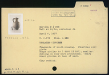 | Description: | Fragments of mouth missing; otherwise complete. Shape similar to P 9895 (Φ 297), but smaller. Ribbing on body more pronounced. Sharp wheel grooves at base of neck. Clay reddish. | |
